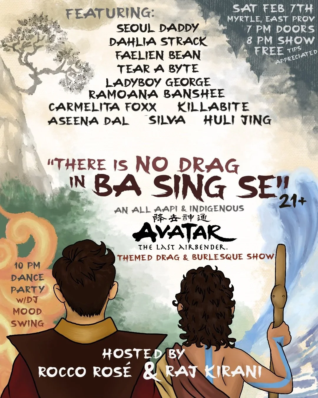 Back to All Events “There Is No Drag in Ba Sing Se” Saturday, February 7, 2026 8:00 PM 11:00 PM Myrtle 134 Waterman Avenue East Providence, RI, 02914 United States (map) Google Calendar ICS A drag and burlesque tribute to Avatar: The Last Airbender, featuring an all-AAPI and Indigenous cast. Co-produced and hosted by Raj Kirani and Rocco Rosé.