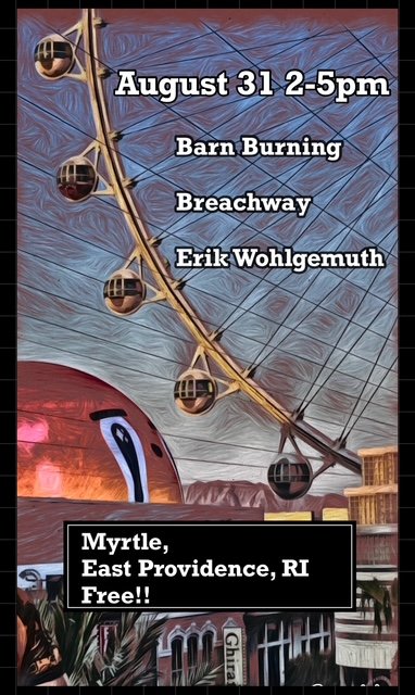 Barn Burning / Breachway / Erik Wohlgemuth Sunday, August 31, 2025 2:00 PM 5:00 PM Myrtle 134 Waterman Avenue East Providence, RI, 02914 United States (map) Google Calendar ICS Barn Burning / Breachway / Erik Wohlgemuth