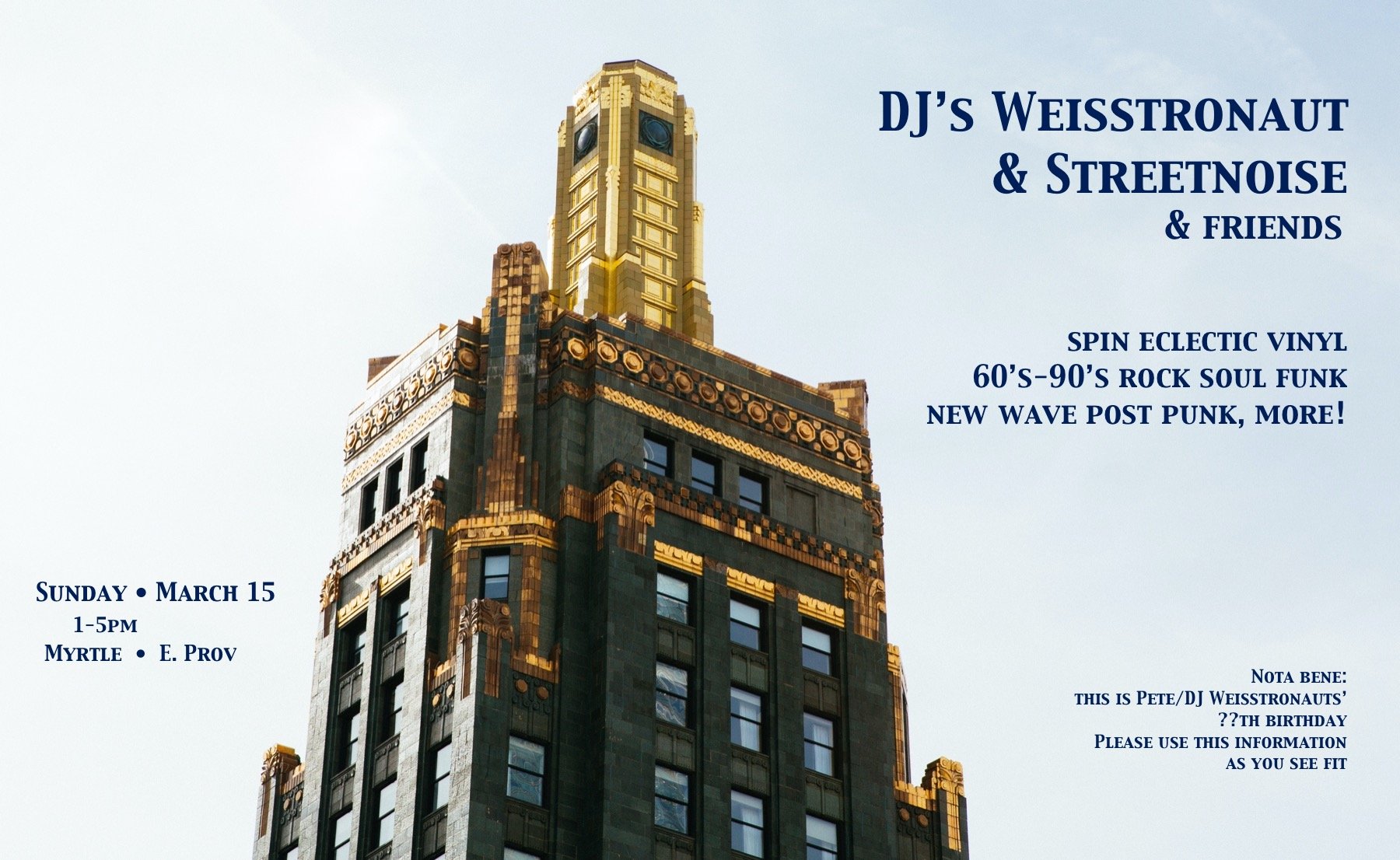 Back to All Events DJ Weistronaut and DJ Streetnoise Vinyl Sunday Sunday, March 15, 2026 1:00 PM 4:00 PM Myrtle 134 Waterman Avenue East Providence, RI, 02914 United States (map) Google Calendar ICS