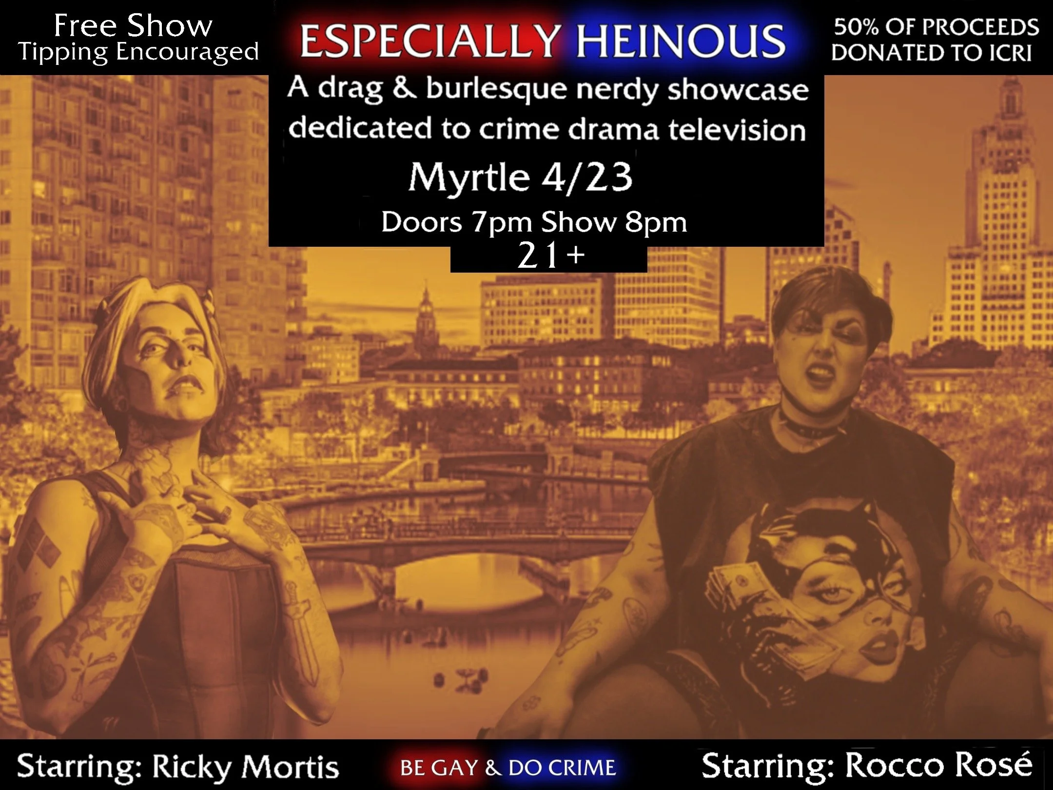 “From the minds of *massive nerds* Ricky Mortis andRocco Rosé comes Especially Heinous (or “Be Gay & Do Crime”!) a drag & burlesque revue dedicated to crime drama television. Do you wanna see Detective Fox Mulder strip down to his tighty whities or Captain Olivia Benson do a tassel twirl?? Well now you can!