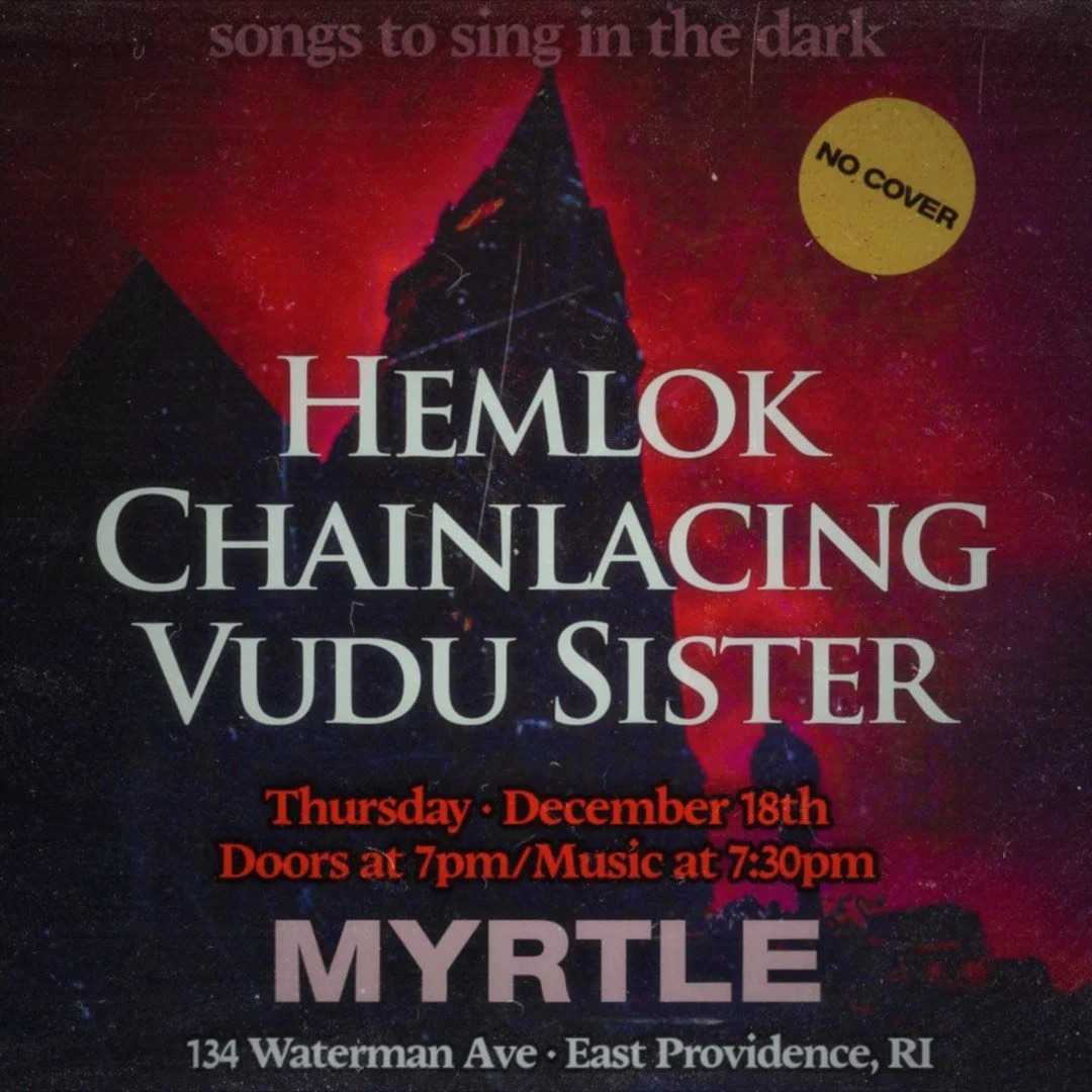 Hemlok - Whether it's multipart instrumentals, sabotaging convention with the odd and exotic, or choosing to be catchy amidst dark aural shades, Hemlok remains Providence RI's most curious musical proposition. Comprised of John (Guitar/Devices), Nate (Bass/devices) and Alex (Drums/percussion) (With special guest Bri - Vocals/Violin)