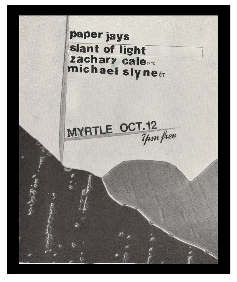 Back to All Events Paper Jays / Slant of Light / Zachary Cale / Michael Slyne Sunday, October 12, 2025 7:00 PM 10:00 PM Myrtle 134 Waterman Avenue East Providence, RI, 02914 United States (map) Google Calendar ICS Paper Jays / Slant Of Light / Zachary Cale / Michael Slyne