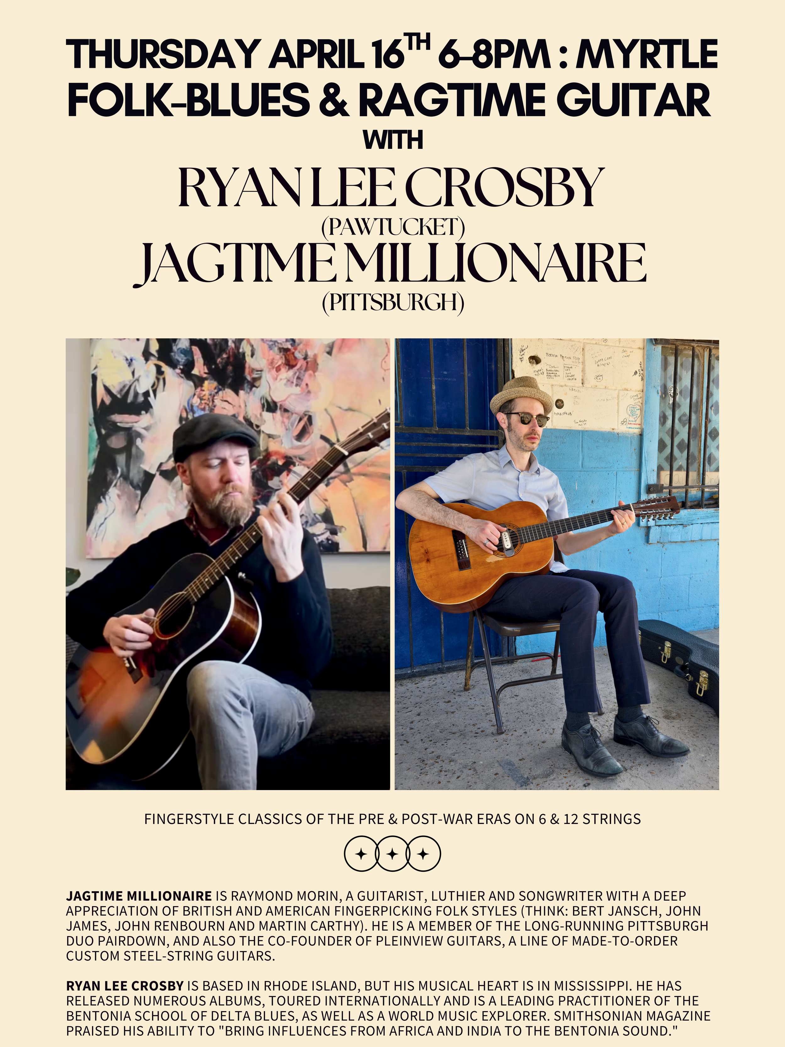 JAGTIME MILLIONAIRE is Raymond Morin, a guitarist, luthier and songwriter with a deep appreciation of British and American fingerpicking folk styles (think: Bert Jansch, John James, John Renbourn and Martin Carthy). He is a member of the long-running Pittsburgh duo Pairdown, and also the co-founder of Pleinview Guitars, a line of made-to-order custom steel-string guitars.