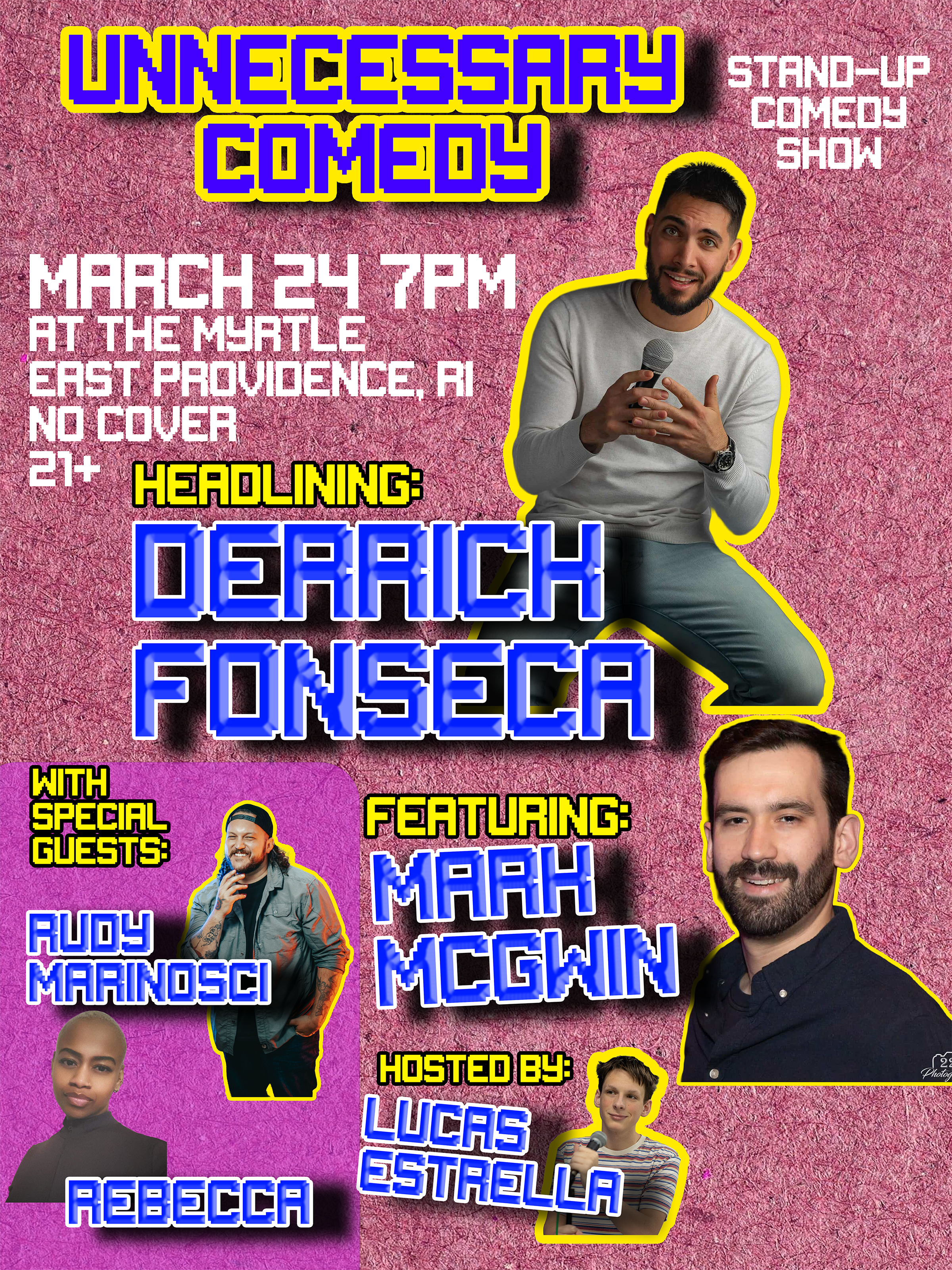 Unnecessary Comedy Tuesday, March 24, 2026 7:00 PM 9:00 PM Myrtle 134 Waterman Avenue East Providence, RI, 02914 United States (map) Google Calendar ICS